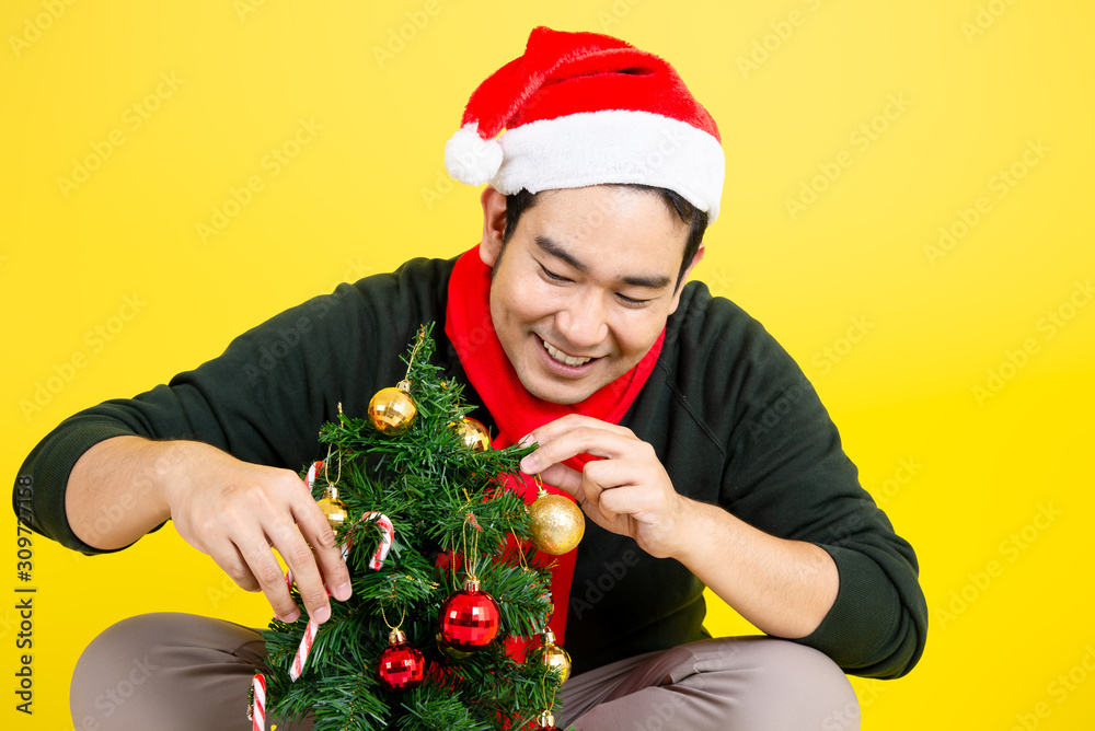 Happy Asian man wearing green sweater and preparing Christmas tree and sitting on yellow background.