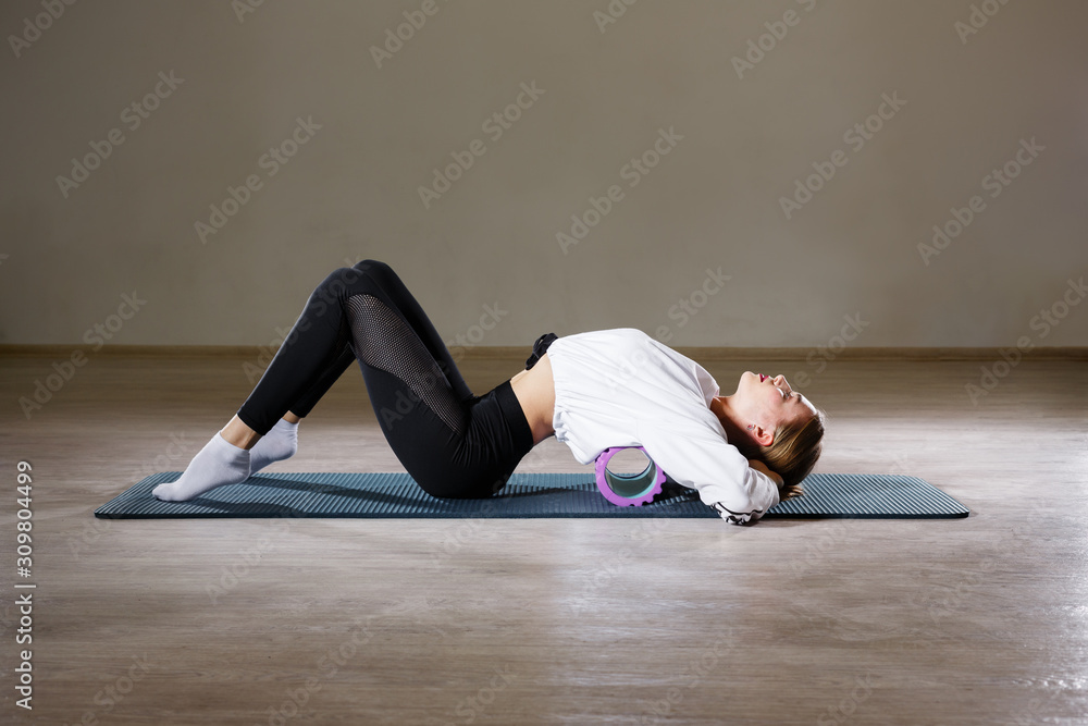 A beautiful slim young girl of European appearance demonstrates exercises with a gymnastic roller for yoga and relaxing her back.