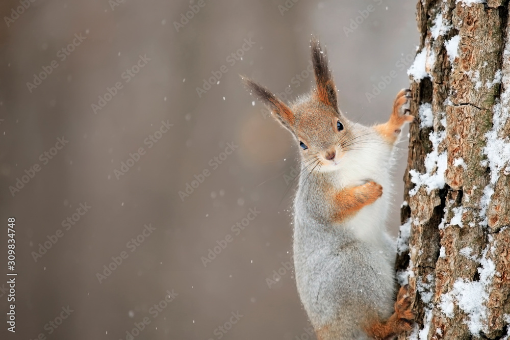 Fluffy winter squirrel on a tree trunk