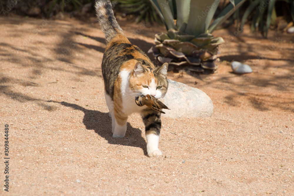 Domestic cat caught a bird. Lucky hunter. Cat holds prey in his teeth