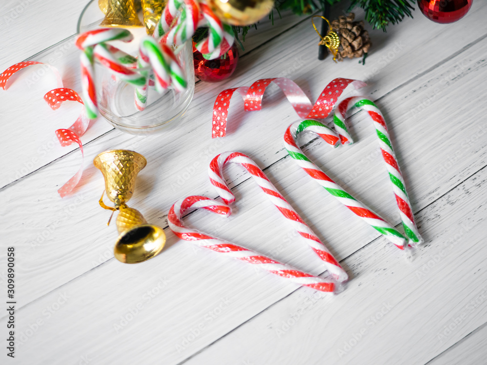 Heart shape christmas candy sticks and christmas tree on wooden table.