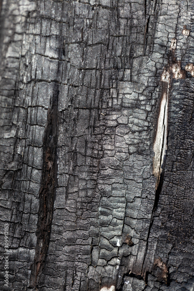 Real burnt texture of tree trunk in forest. Vertical color photography.