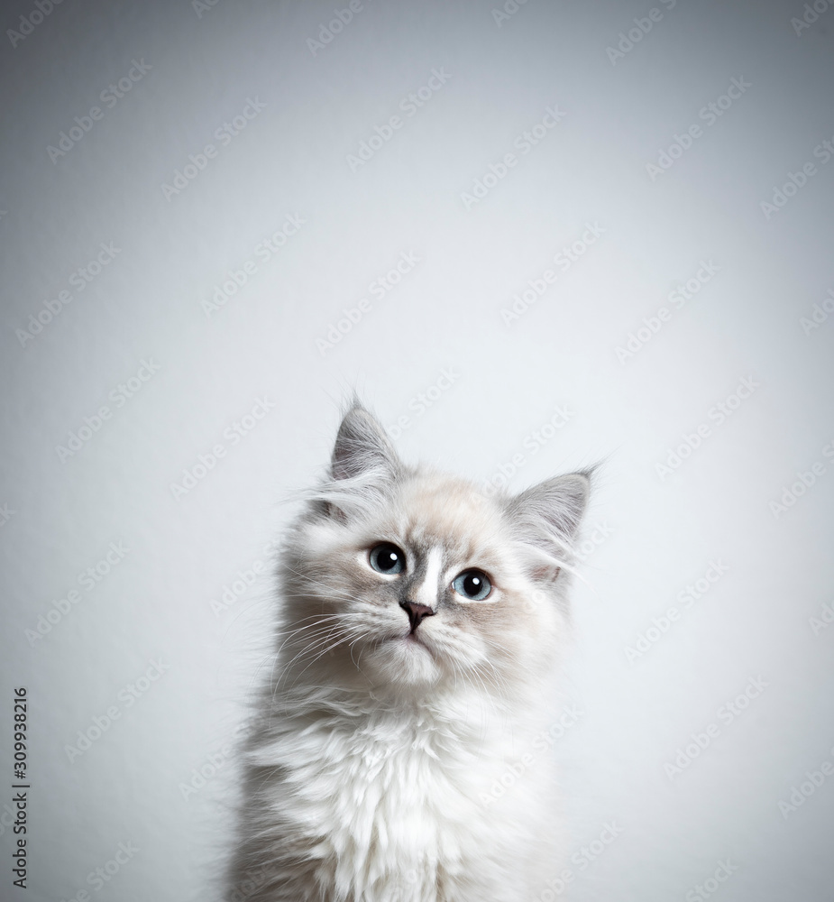 portrait of a cute blue silver tabby point white ragdoll kitten looking at camera tilting head in front of white background with copy space