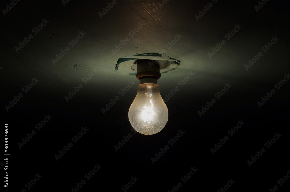 Dirty tungsten light bulb illuminated on dark background. Dusty light bulb in basement.
