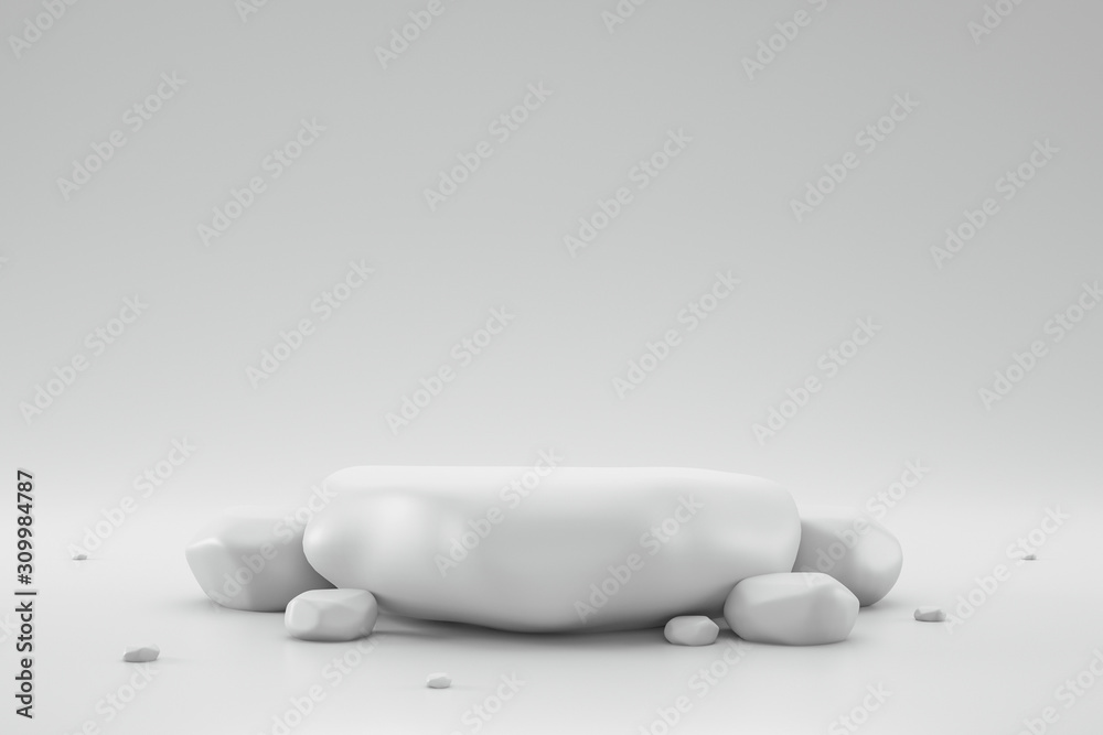 Modern pedestal or podium display with stone platform concept on white background. Blank shelf stand for showing product. 3D rendering.