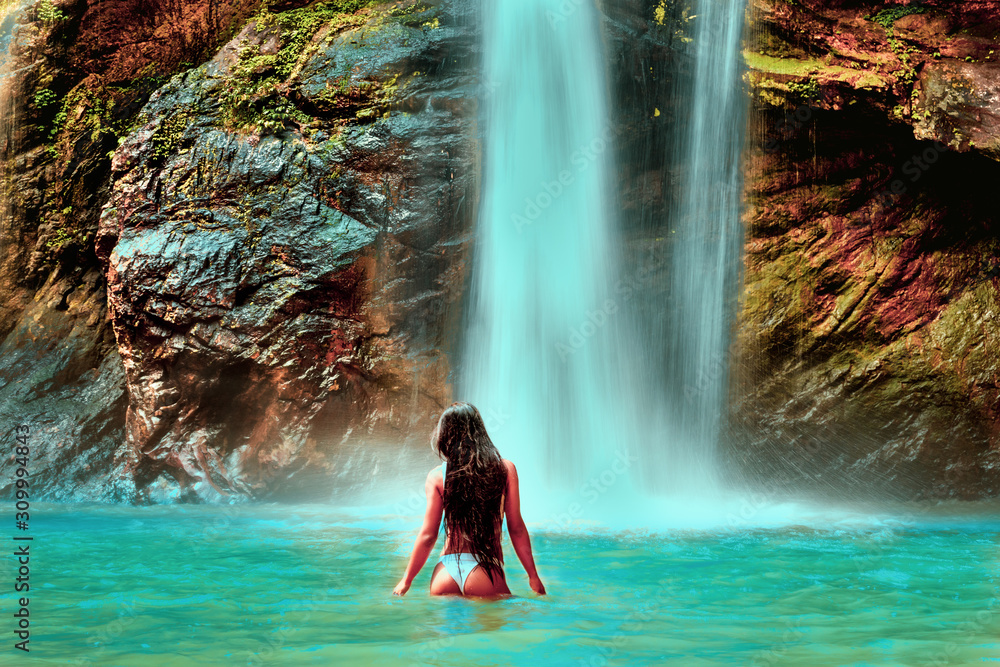 Young happy girl enjoing the waterfall. Woman standing in front of waterfall with rased hands and smile. Concept of ecotourism travel