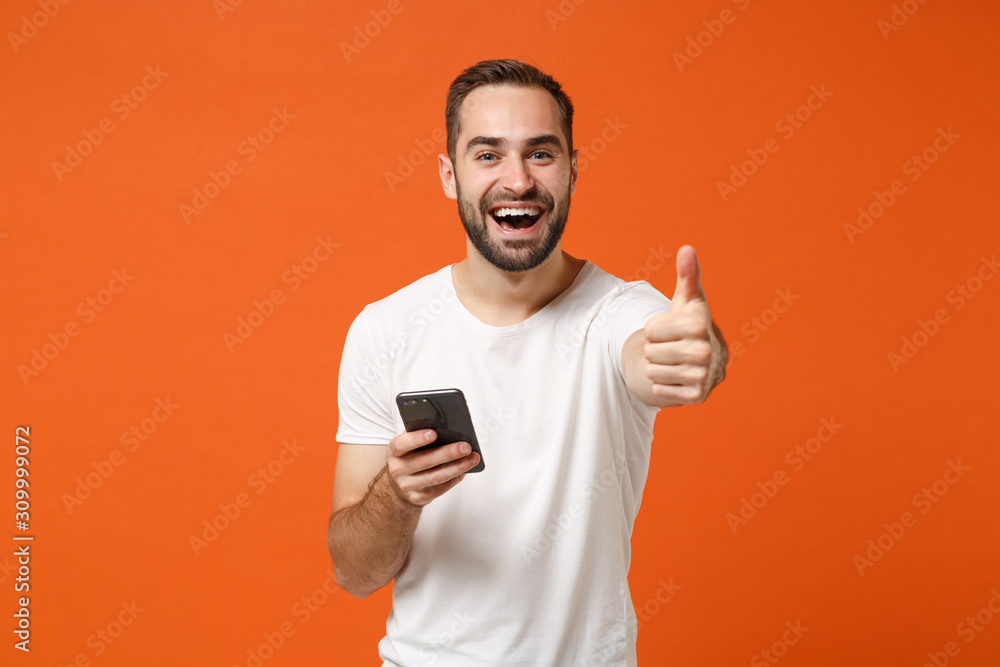 Cheerful young man in casual white t-shirt posing isolated on orange wall background in studio. People lifestyle concept. Mock up copy space. Using mobile phone, typing sms message, showing thumb up.