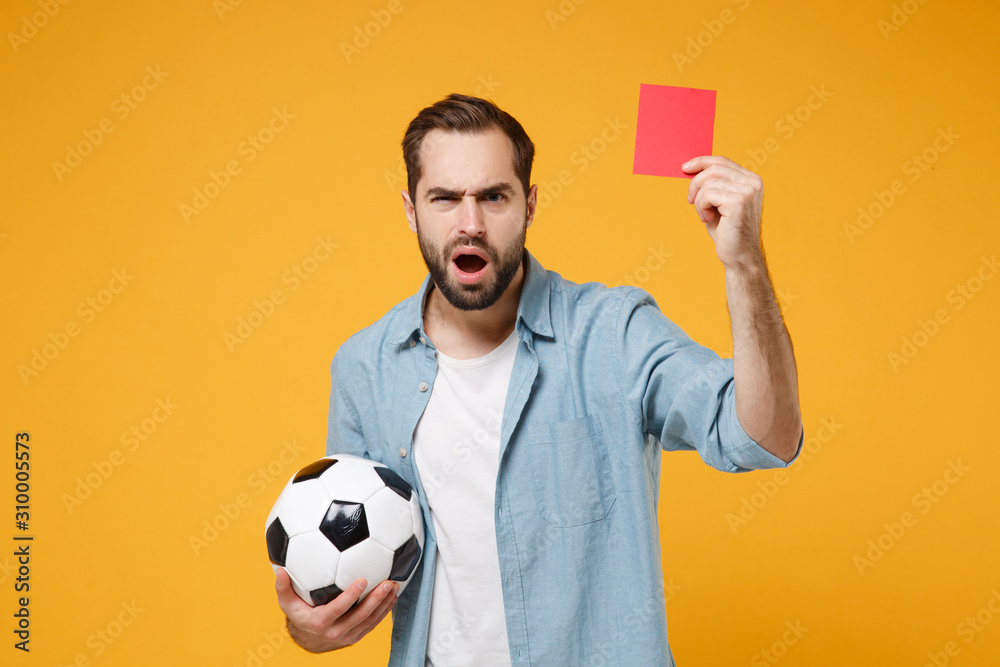 Shocked bewildered young man in blue shirt posing isolated on yellow orange wall background. People lifestyle concept. Mock up copy space. Hold soccer ball, red card, propose player retire from field.