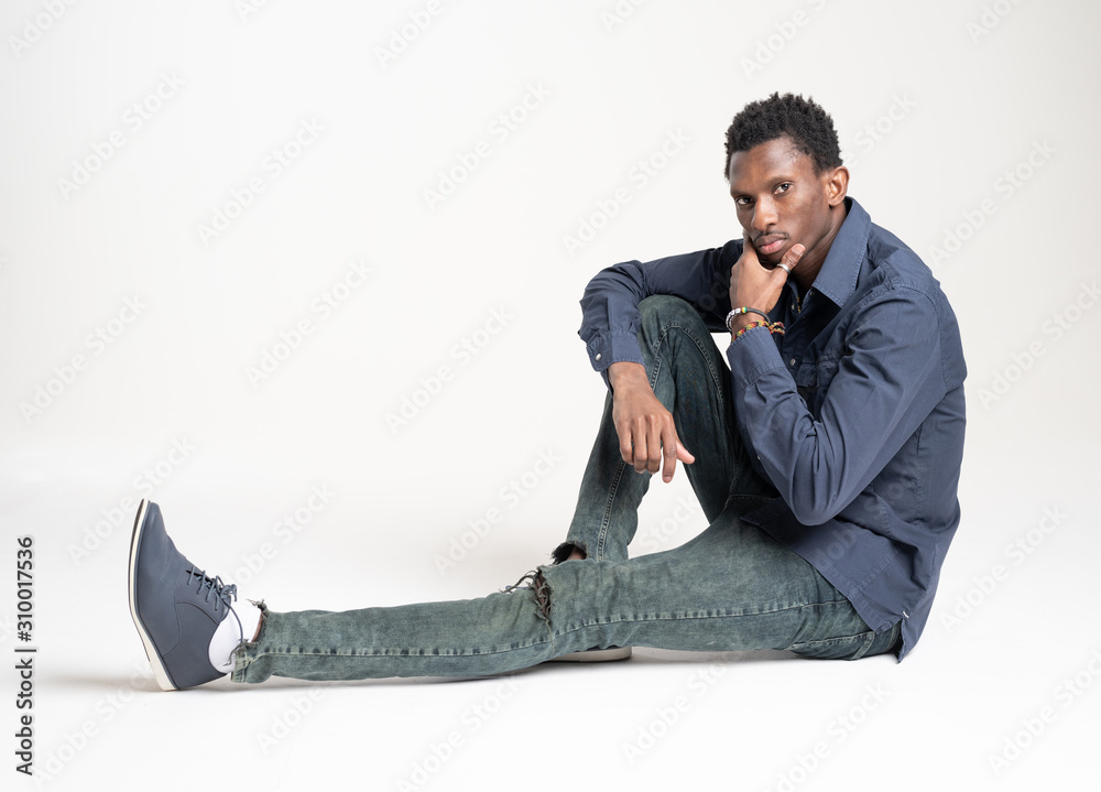 A black guy (man) in a blue shirt and jeans is sitting on a white background