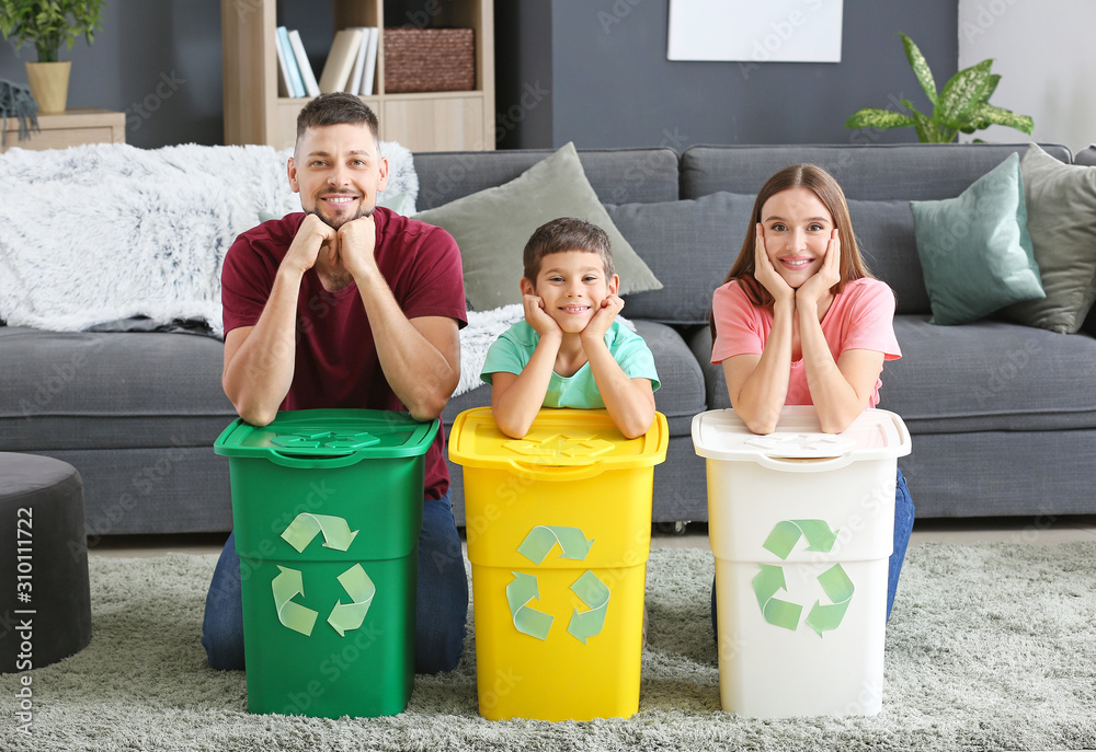 Family with containers for garbage at home. Concept of recycling