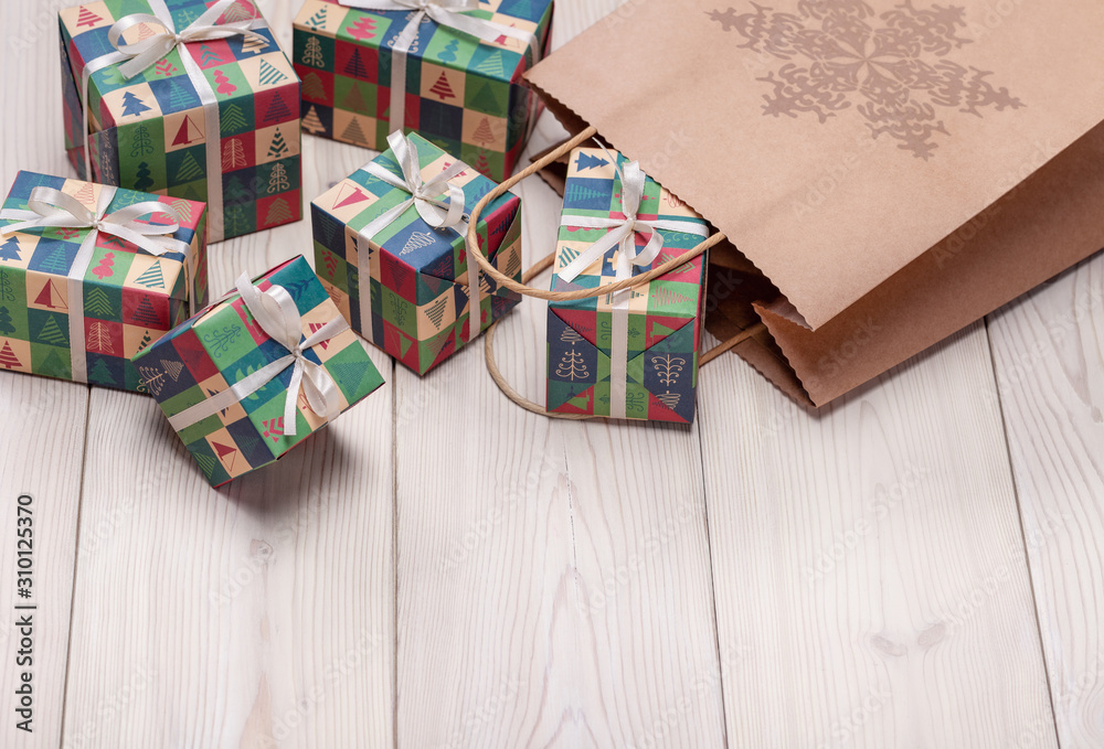 Boxes with gifts in holiday paper, on a wooden package. The concept of winter holidays.