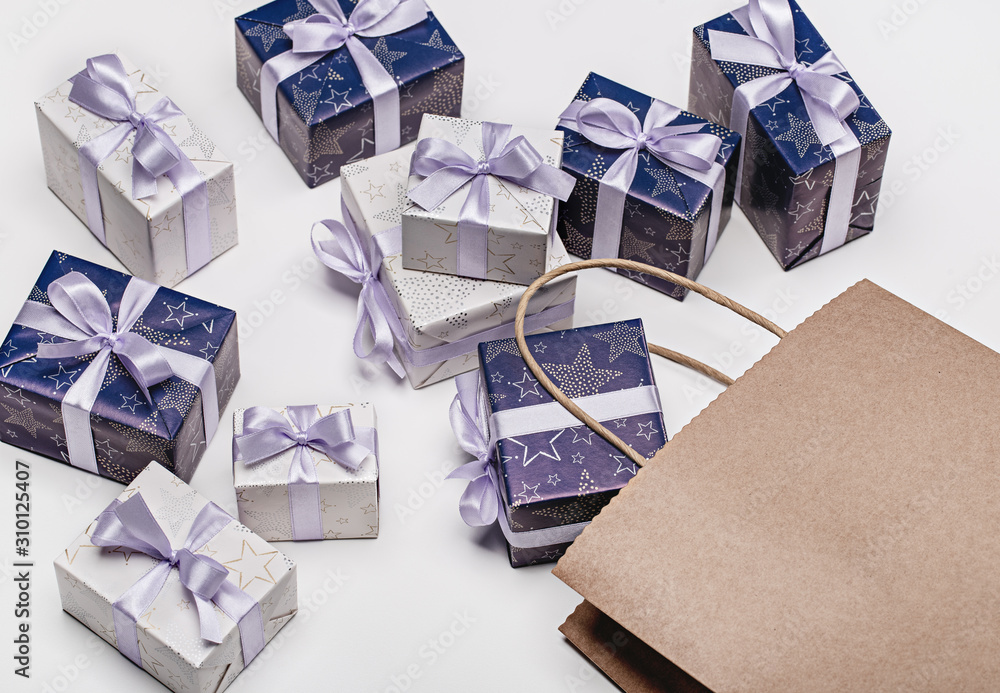 Gift boxes with patterns, lilac ribbon with a bow, paper bag. Surprise for different holidays on a wooden background. Copy space.