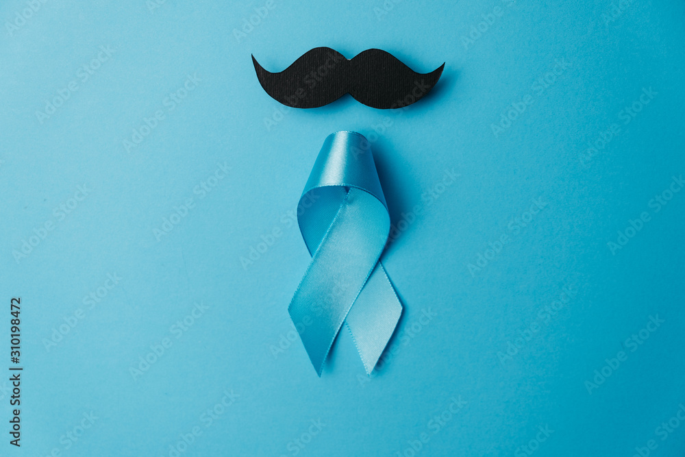 Light blue ribbon with mustache on blue background. Healthcare, International men, Father and World cancer day concept. Flat lay, copy space