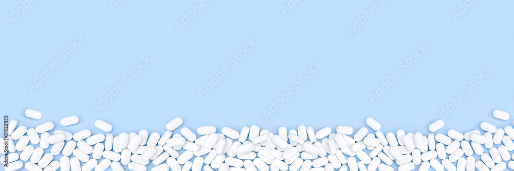 Blue monochrome border of pile of pills tablets on the table. Flat lay long banner. Healthcare and medicine concept drugs safety consumption or misuse with copy space