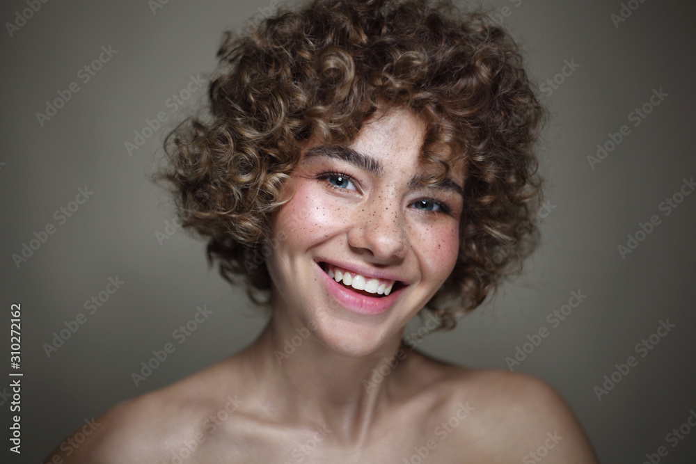 Vintage style portrait of smiling beautiful young freckled girl with curly hair, selective focus