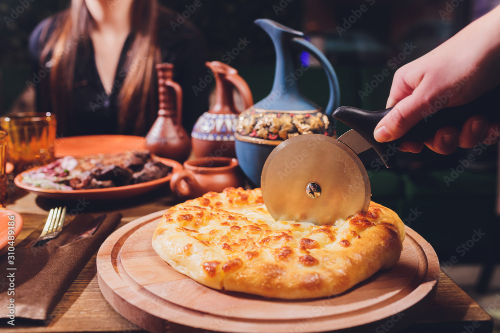 Pizza cutter wheel slicing ham pizza with capsicum and olives on wooden board on table.
