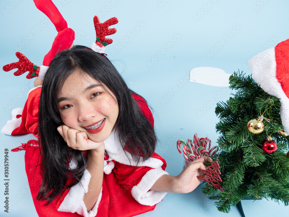 Asian teenager girl wearing Santa Claus costume lying on floor with Christmas tree and gift boxes.