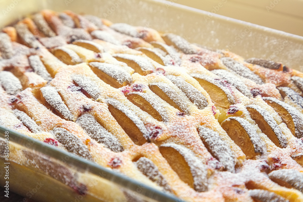 cake decorated with icing sugar and slices of fruit, in backlight. Close-up side view
