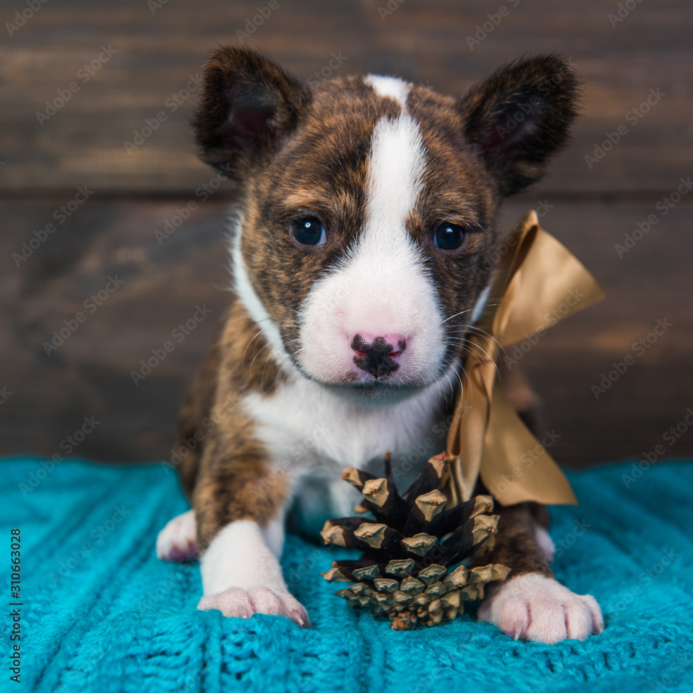 Basenji puppy dog with big golden bow and fir cone