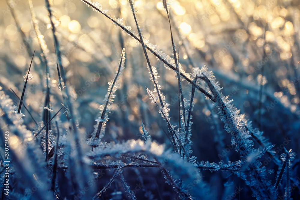 natural background with shiny transparent crystals of cold frost cover the dry grass like beads on a field on a morning Sunny winter day