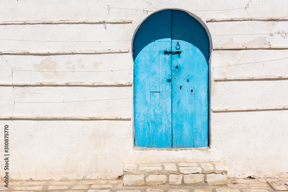 Rustic wall and old wooden blue door. Traditional rural house facade in Tunisia