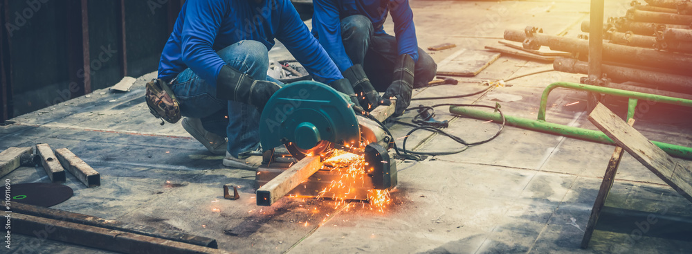 Close up view of professional focused two worker man in uniform working on the metal pipe