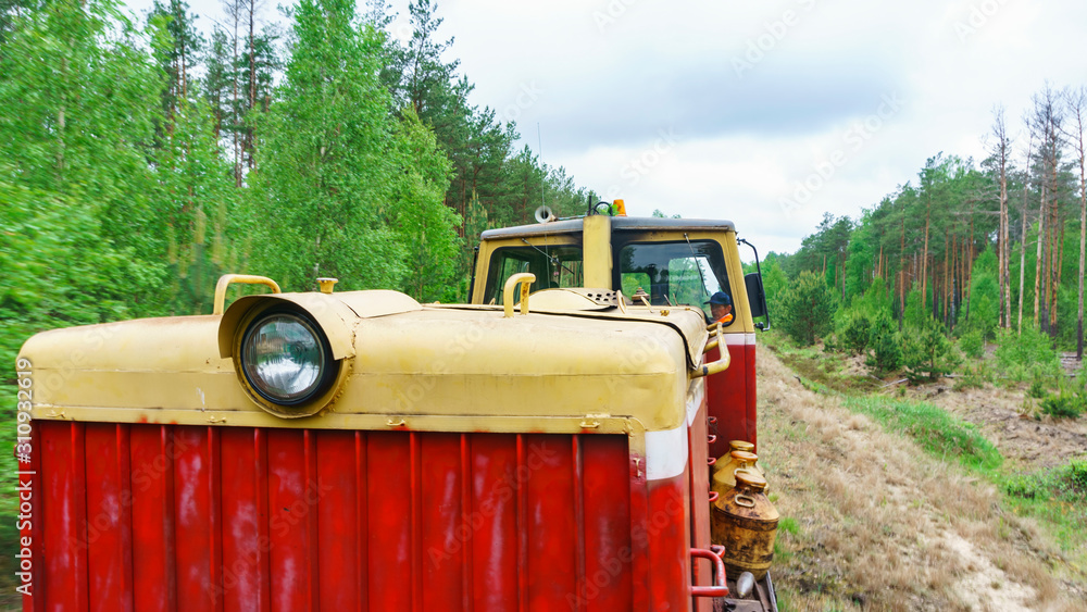 View of a part of narrow gauge railway locomotive on forest background. Extraction and transportations of peat.