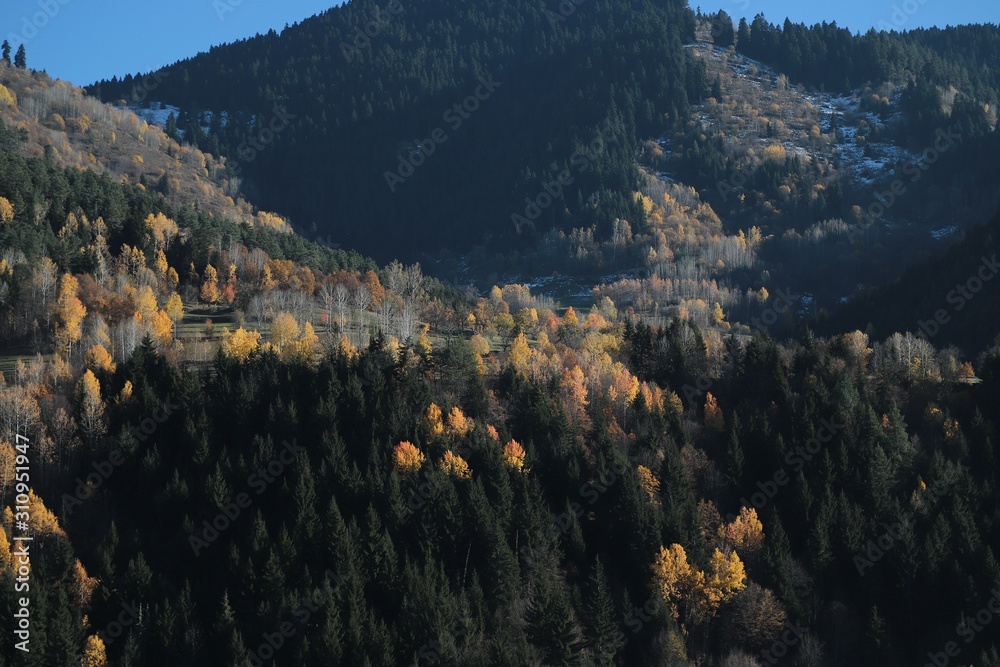 Autumn mountain forest village landscape. Mountain village in autumn.