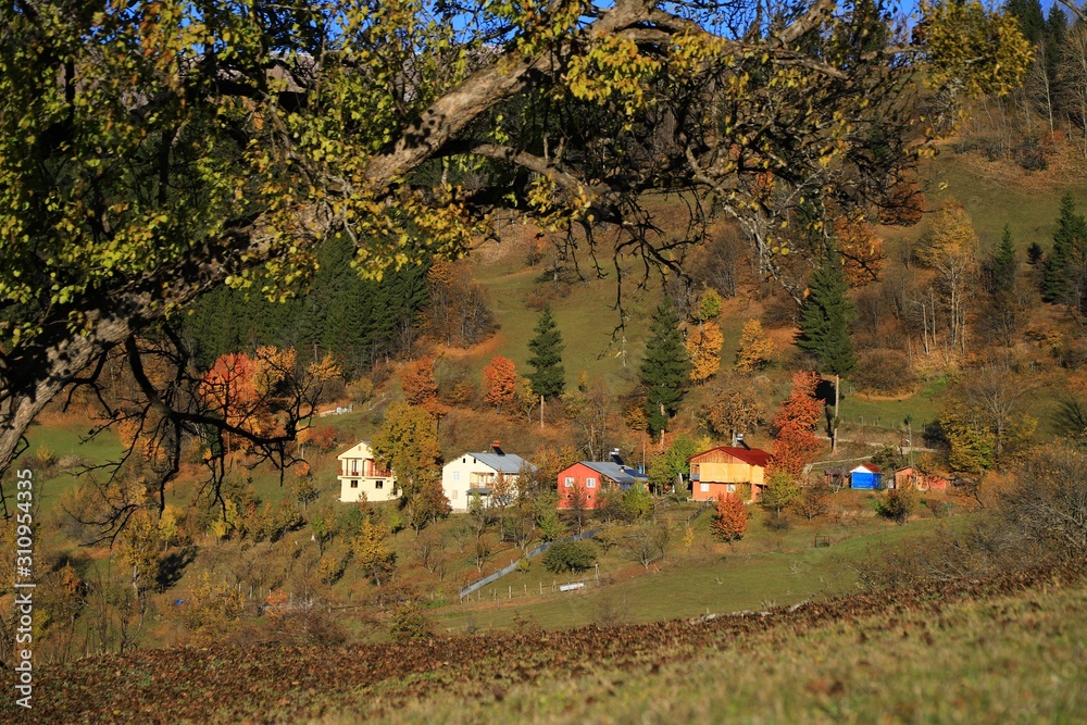 Autumn mountain forest village landscape. Mountain village in autumn.