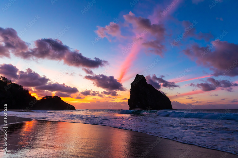 Stunning colorful sunset in Cacimba do Padre beach in Fernando de Noronha, Brazil with water reflection. Several clouds turned pink forming colorful rays in the sky and in the sand.