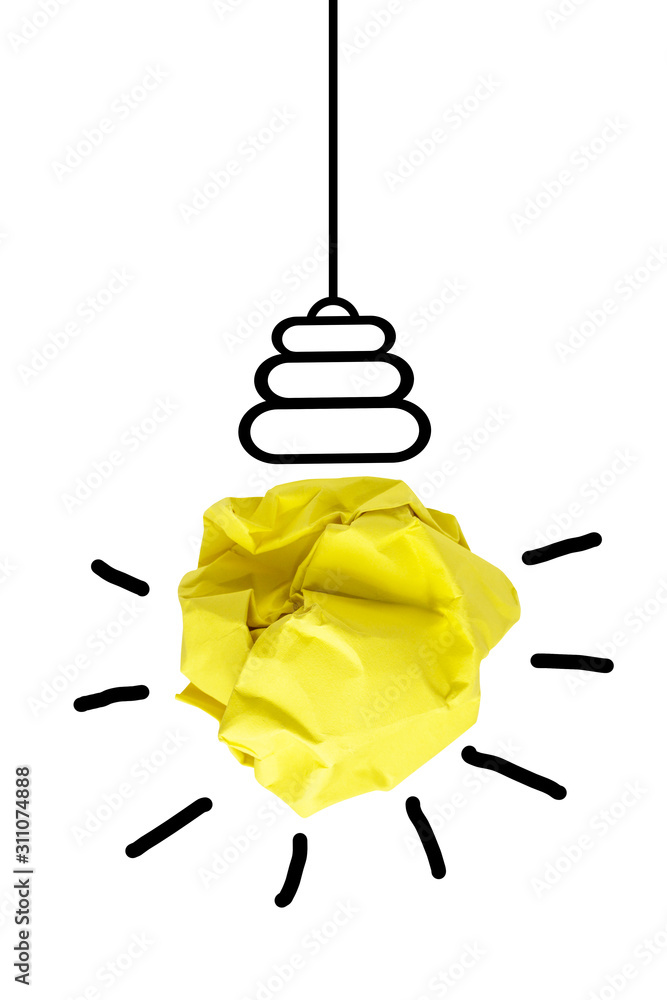 Glühbirne aus Papierkugel hängt vor weißem Hintergrund