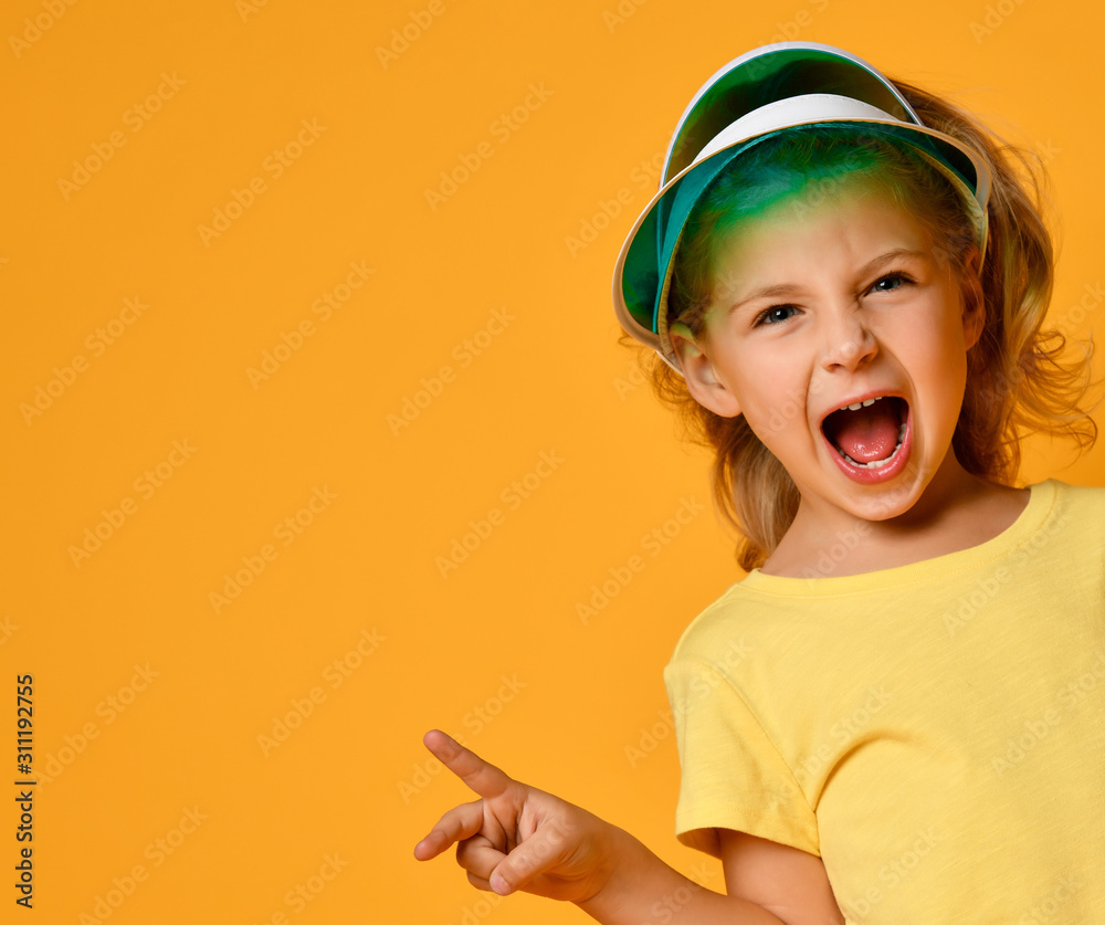 Little smiling blond girl in yellow t-shirt feeling fun over yellow background. Healthy lifestyle and clean eating concept.