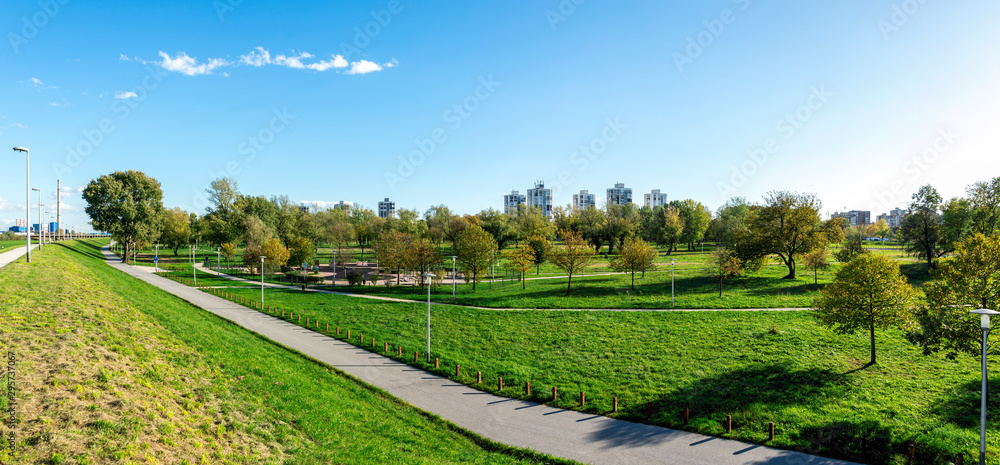 Happy smiling girl enjoying snowfall, winter holidays, walking in snow cowered street of European city. Model wearing red beret, skirt, boots, grey scarf, coat, white sweater, holding black bag