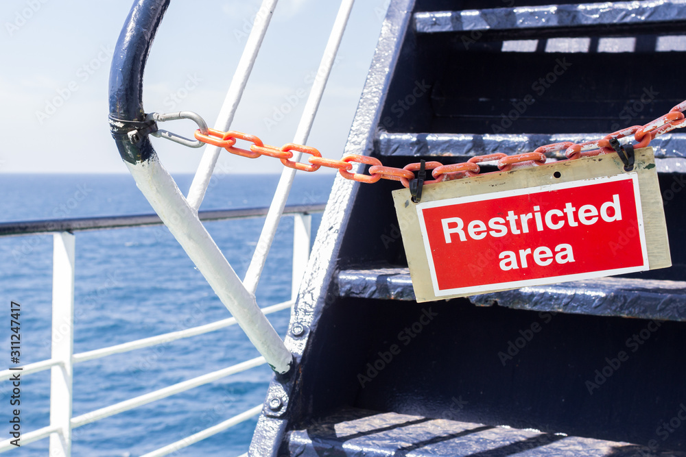 No entry for unauthorised people. Warning sign. Information plate. Limited access. Closed area. Safety on a passenger ship. Restriction notice. Forbidden passage.