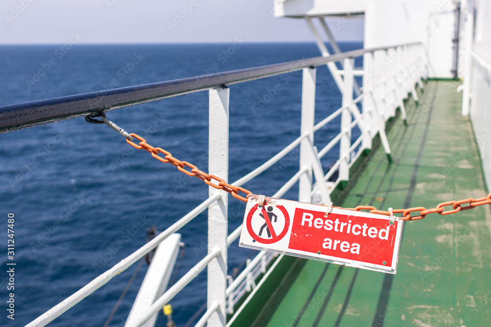 No entry for unauthorised people. Warning sign. Information plate. Limited access. Closed area. Safety on a passenger ship. Restriction notice. Forbidden passage.