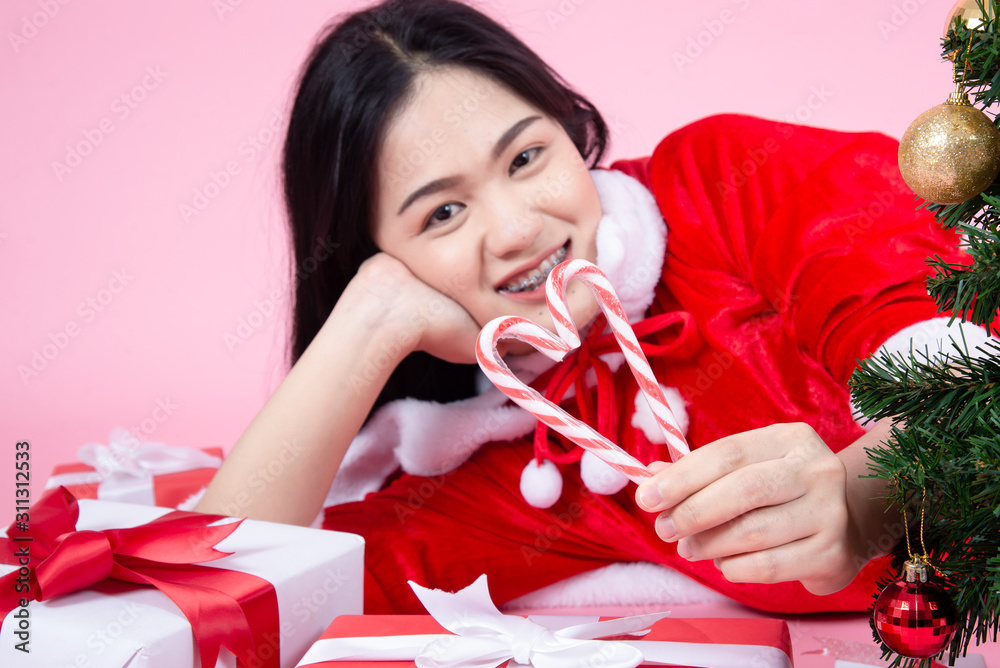 Asian woman wearing Santa Claus costume lying on floor with Christmas tree and gift boxes on pink.
