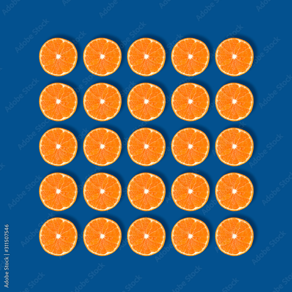 Fruit pattern of fresh mandarin slices isolated on deep blue background. Flat lay, top view.