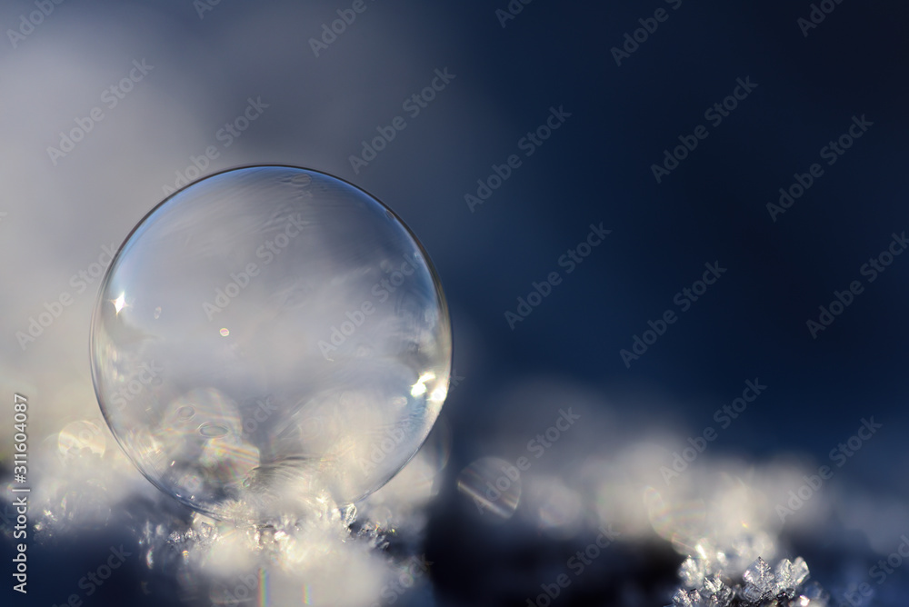 Winter mood with an iridescent transparent soap bubble on snow with white and blue background and space for text