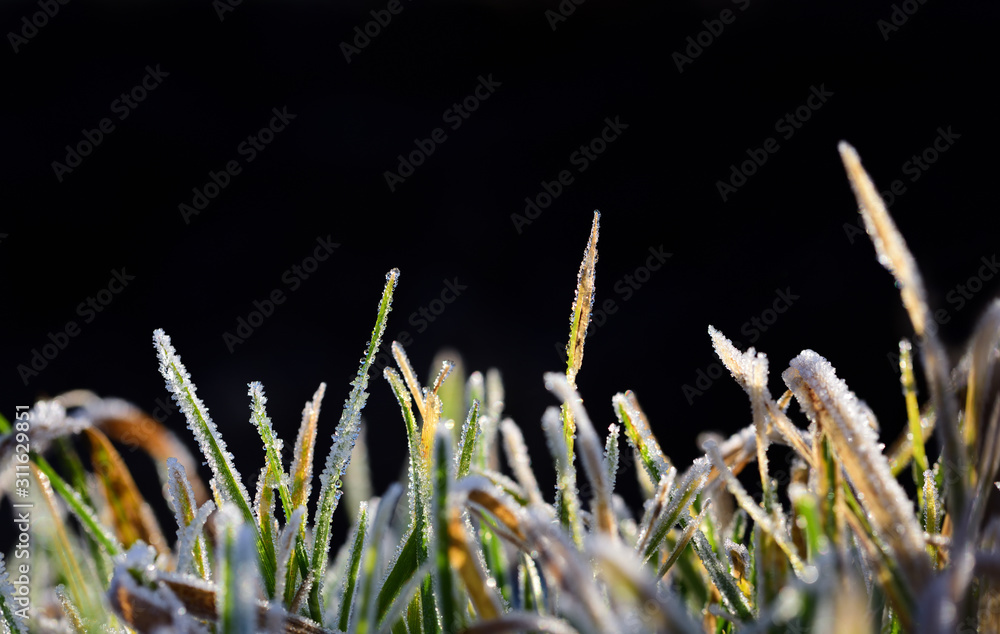 Frozen blades of grass with white border against dark background in early winter sunlight with space for text
