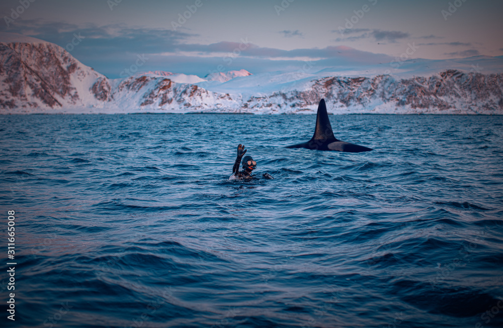 Happy diver greetings and swimming with orca killer whale in sunset norway fjord on watere
