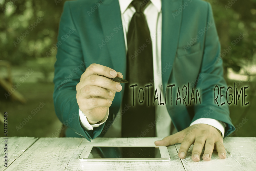 Text sign showing Totalitarian Regime. Business photo text mode of government that prohibits opposition parties Businessman holds pen and points into copy space