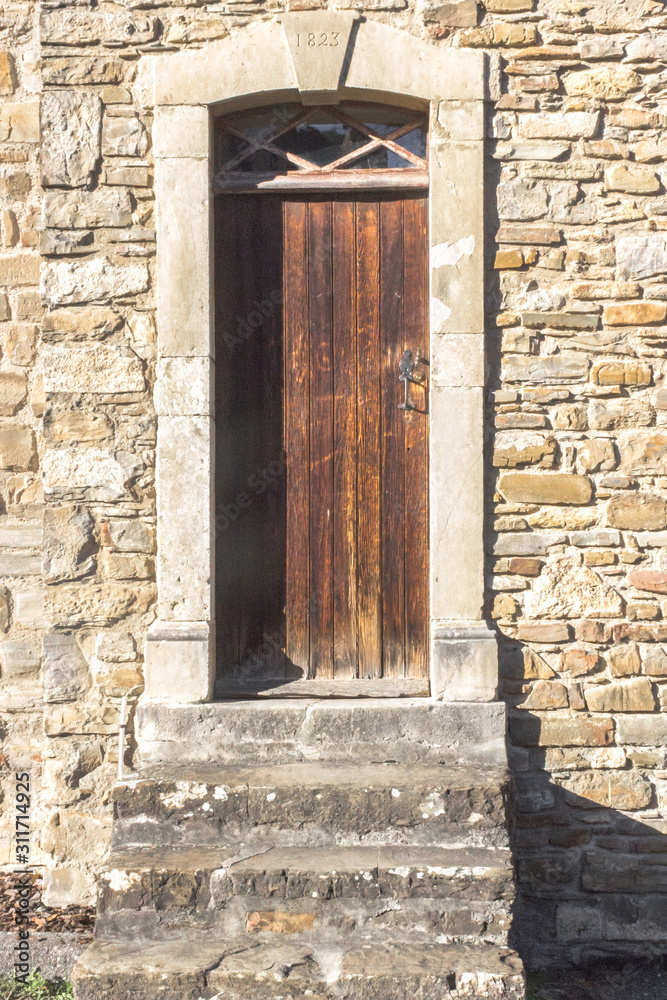 A private house. Country mansion. Old building. Closed entrance to the house. French village. Stone facade. Medieval architecture. Rural cottage. Stone wall. Landscaping in the yard.