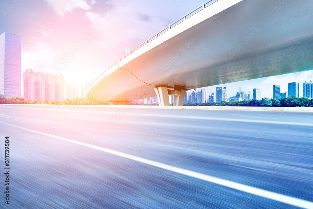 Under the overpass, there are no cars and no people on the asphalt road, with the modern urban architecture skyline as the background.