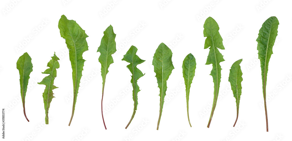 set of green dandelion leaves isolated white background