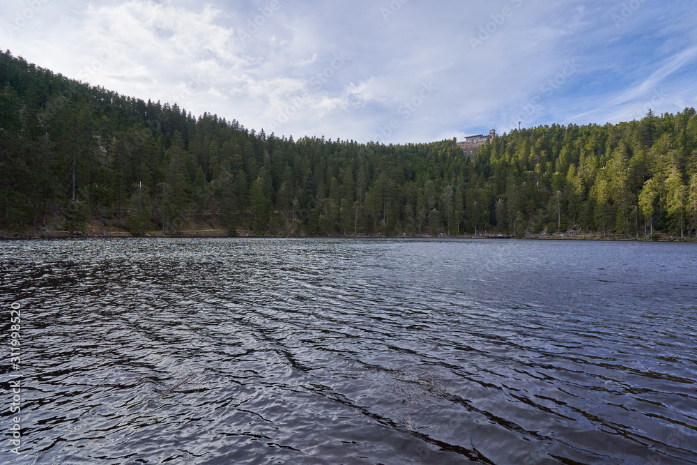 Mummelsee mountain lake in Schwarzwald and dense coniferous forest, Germany
