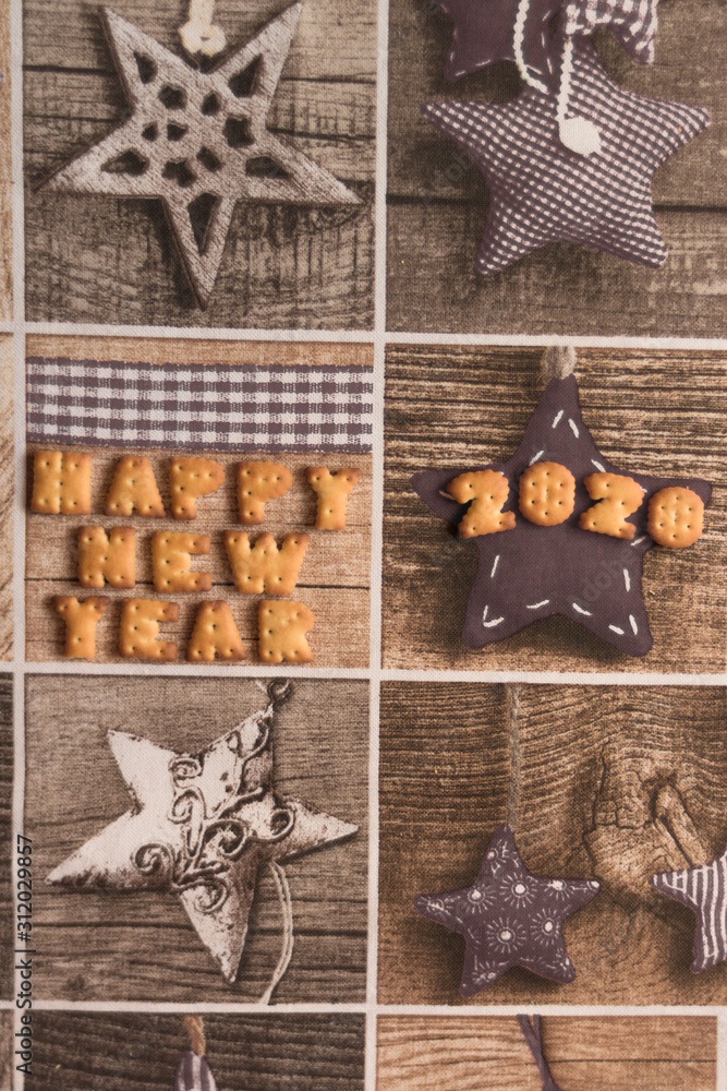 Vintage Greeting Card. Merry Christmas. Happy New Year. Letters from cookies. Congratulations on 2020. Festive inscription. Christmas pattern and ornament.