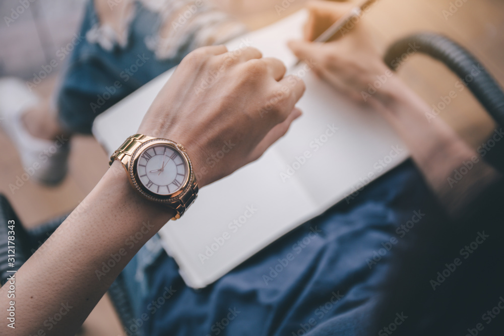 looking at luxury watch on hand check the time writing business information in notepad at workplace.concept for managing time organization working,punctuality,appointment.fashionable wearing stylish