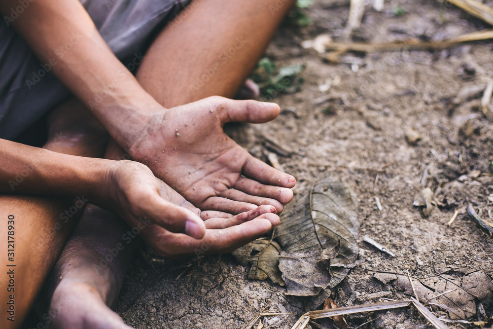 hands poor child or beggar begging you for help sitting at dirty slum. concept for poverty or hunger people,human rights,donate and charity for underprivileged children in third world