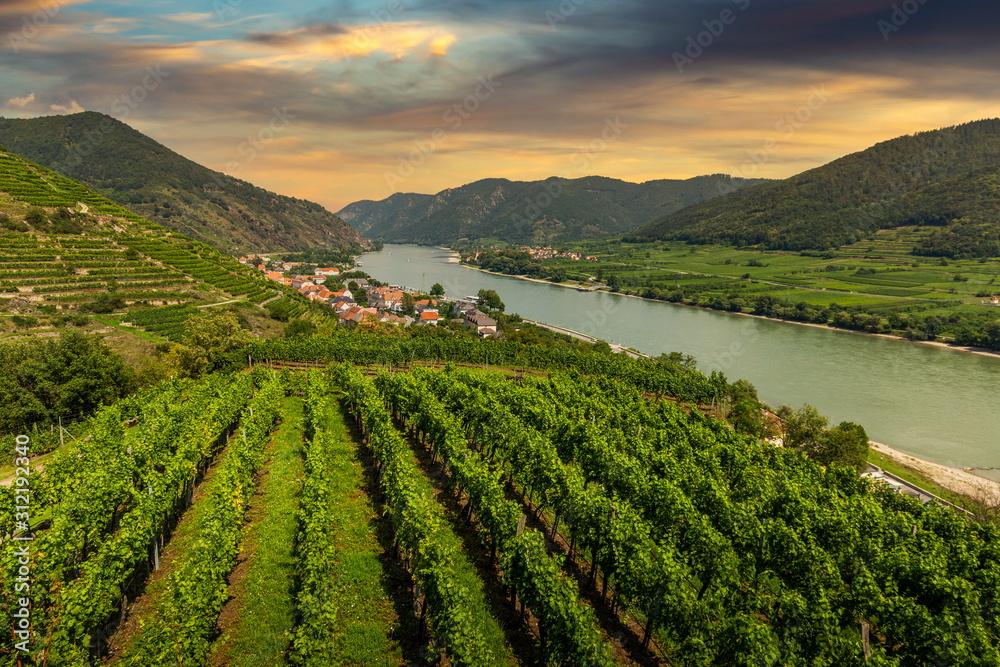 Green vineyard landscape in Wachau valley with the river Danube and town Spitz on a sunset. Lower Austria.