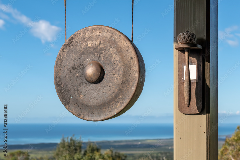 A gong hangs outdoors next to a mallet mounted on a post. Background is an ocean view, lush vegetation and blue sky.